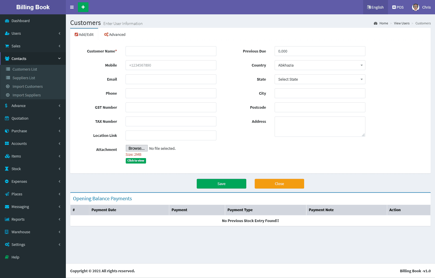 Adding a Customers it's a very easy task. Enter Customer name, Mobile, Phone, Email, GST Number, TAX Number,