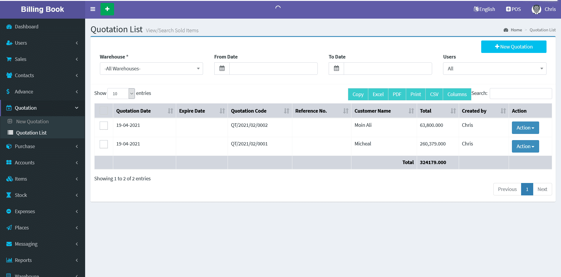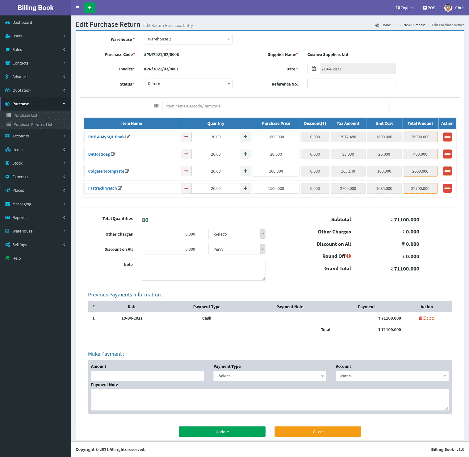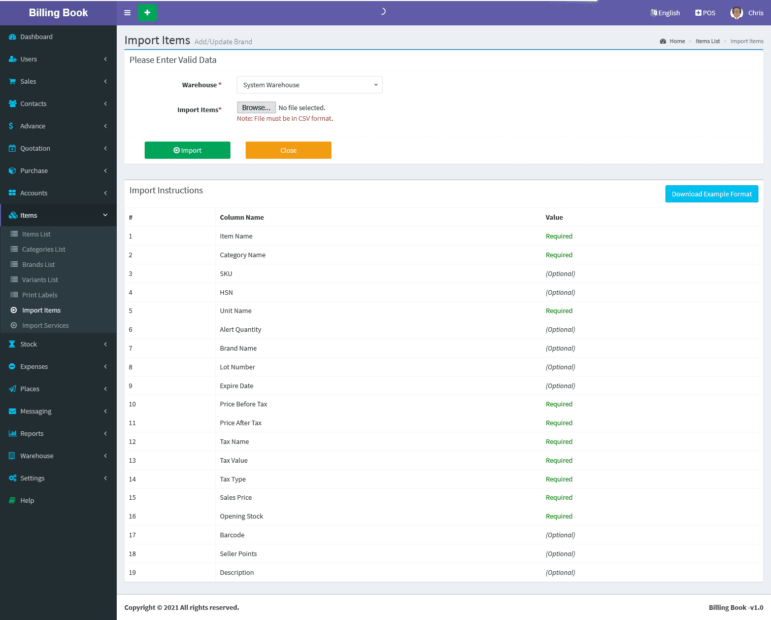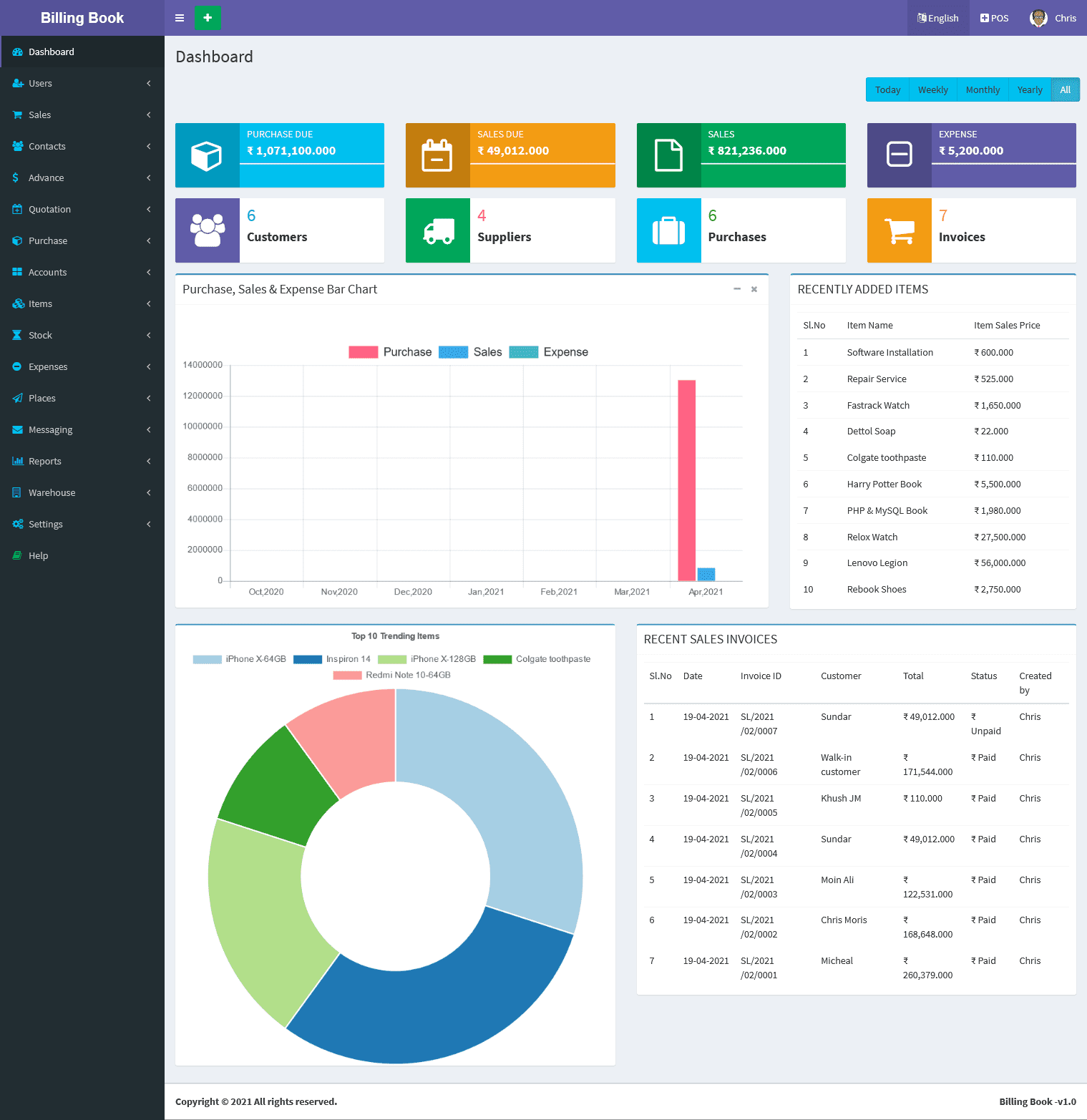 Billing Book is a PHP based web application software, where user can track and manage Items & Stock, Suppliers, Customers, Items Categories, Sales Invoice, Purchase Invoice, users and get all the reports which are require to your office with many more features. You can create any number of Warehouses and Users.