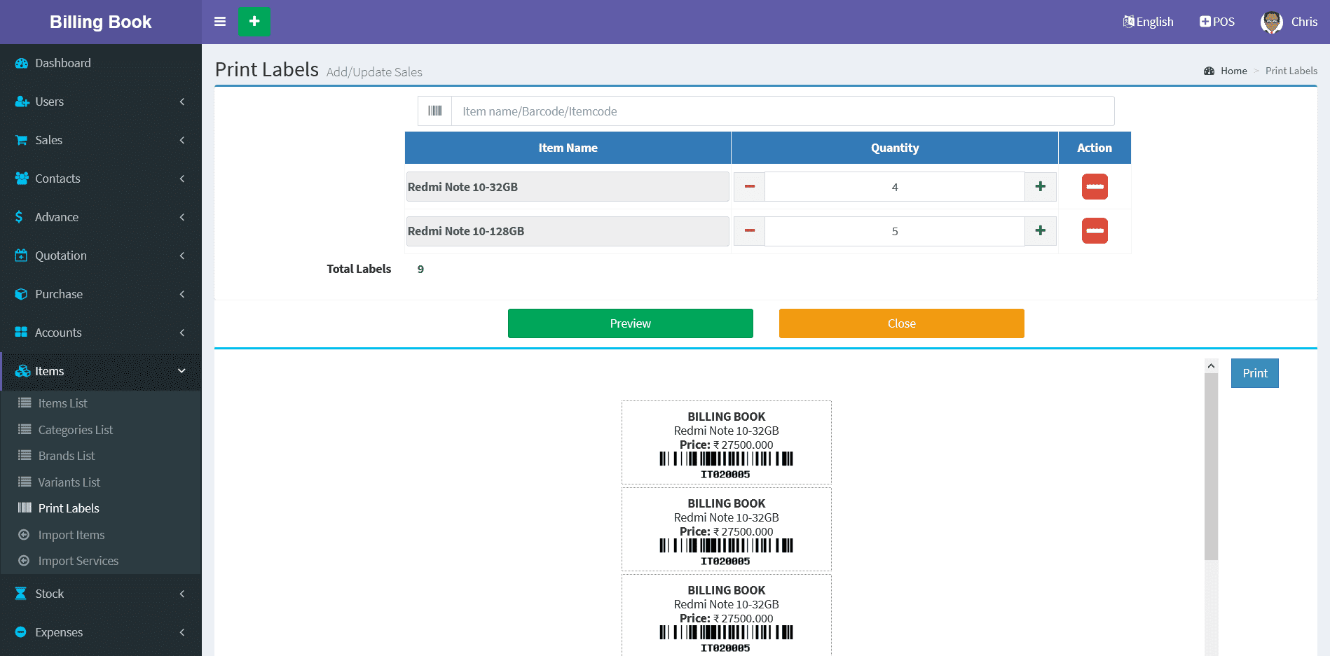 Select Items From Search Box and Select Number of quantities of Labels and Click on Preview Button and take prints.