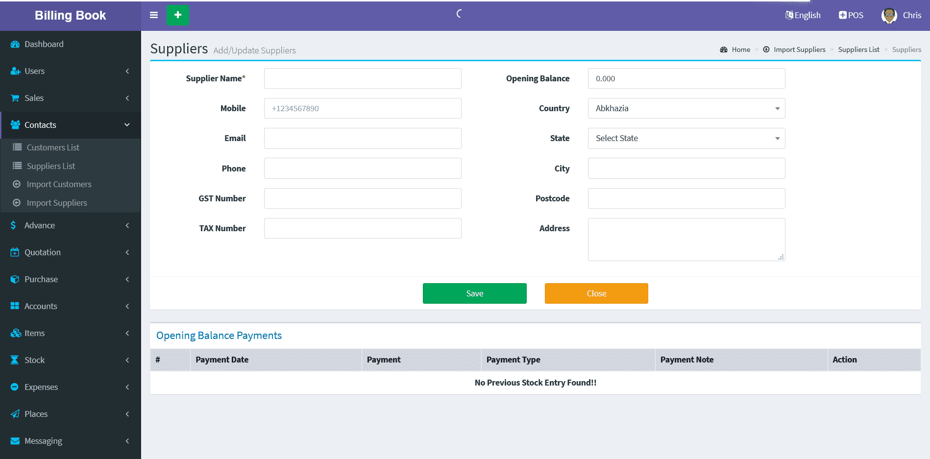 Adding a Suppliers it's a very easy task. Enter Supplier name, Mobile, Phone, Email, GST Number, TAX Number,